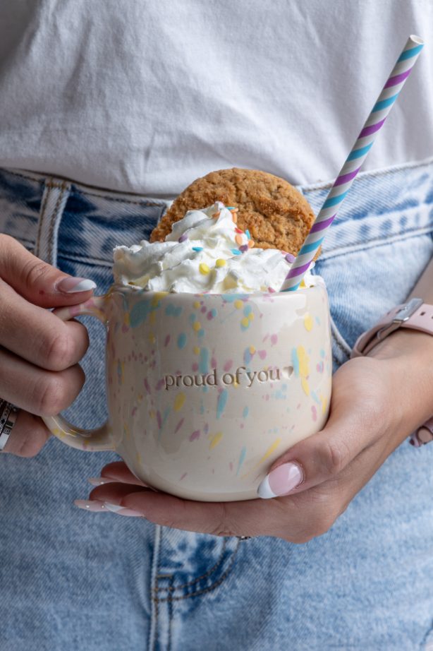 Αυτή η μεγάλη χειροποίητη κεραμική κούπα με τις παιχνιδιάρικες χρωματιστές πιτσιλιές και το μήνυμα "proud of you" περιμένει να γίνει δική σου!