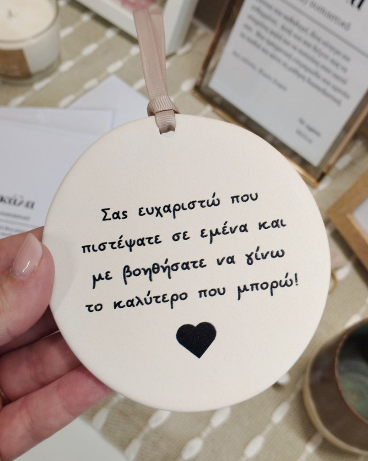 Χειροποίητο στρογγυλό κεραμικό σε φυσικό/ off white χρώμα και τυπωμένο μήνυμα με διάμετρο 9,5cm