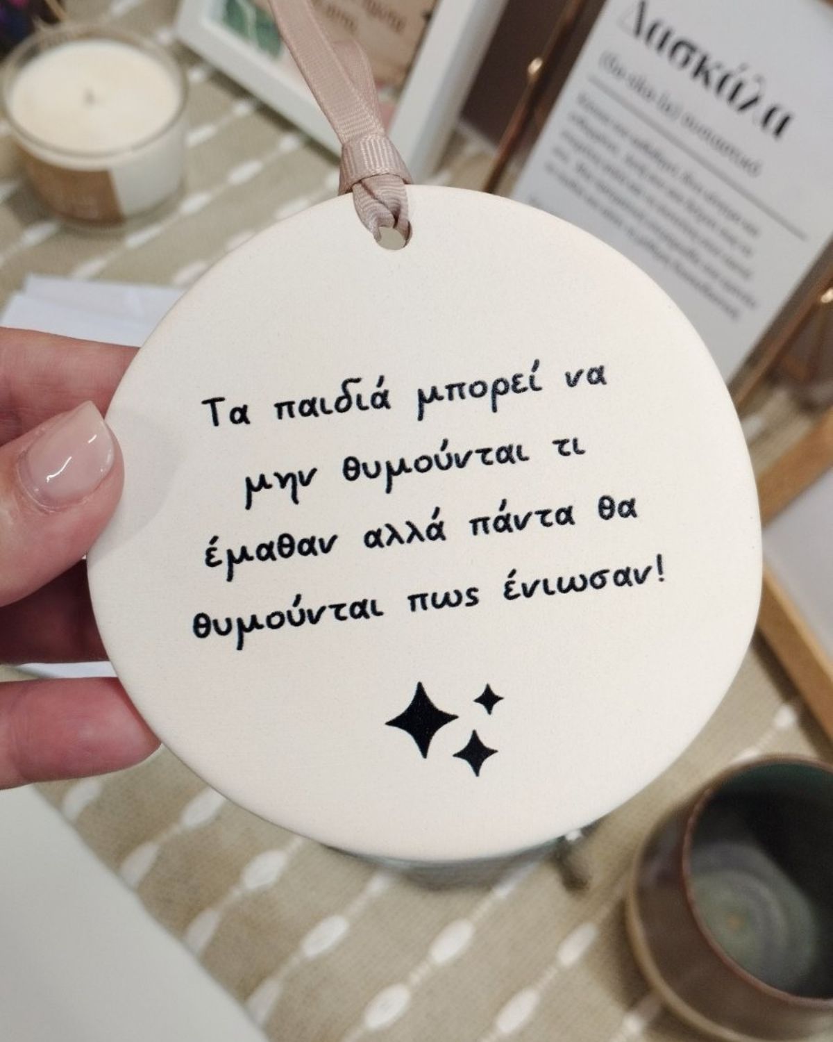 Χειροποίητο στρογγυλό κεραμικό σε φυσικό/ off white χρώμα και τυπωμένο μήνυμα με διάμετρο 9,5cm
